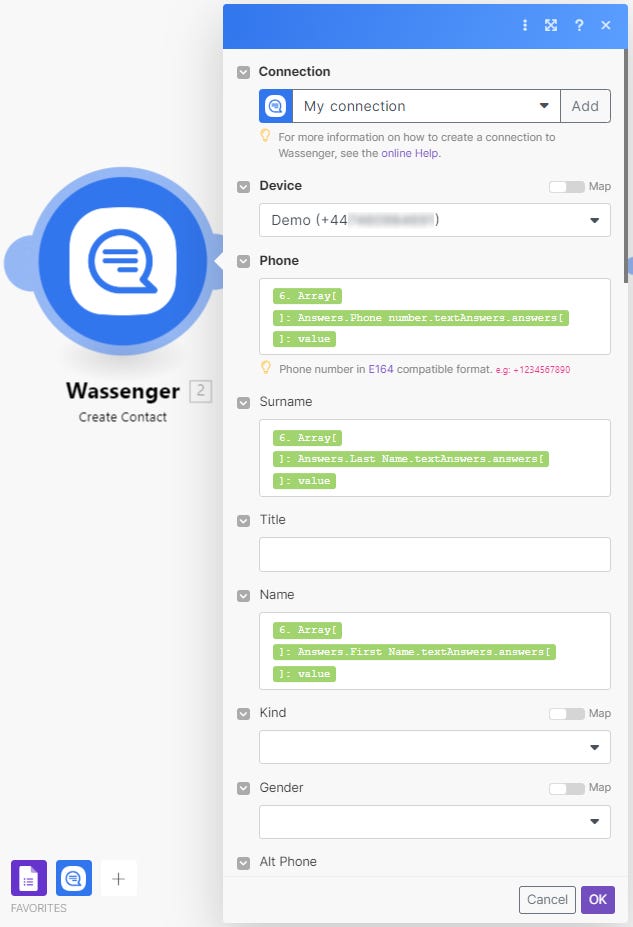 Let’s connect to the Wassenger module and select the ‘Create Contact’ event. Wassenger hosts a wealth of useful events that can enhance productivity and save time when creating scenarios with Integromat.