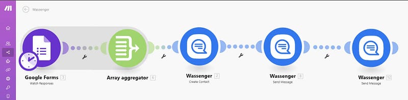 As Wassenger is already installed in our Integromat instance, we will add the Wassenger module and the scenario will take form, it should look like this