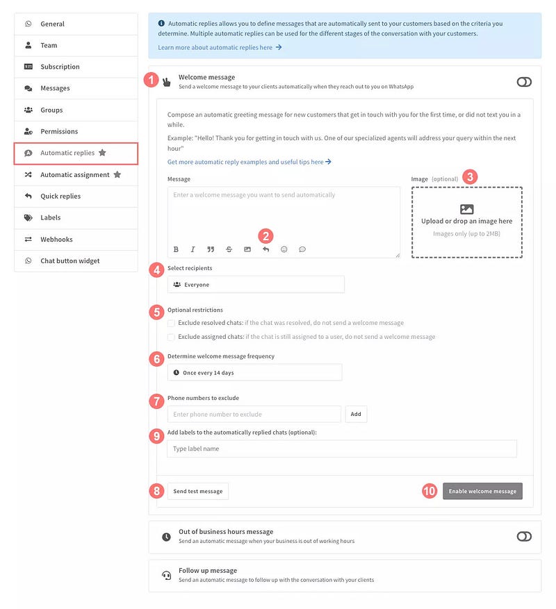 Additionally, unlike WhatsApp Business, with Wassenger you can also conveniently include images in your automatic replies.