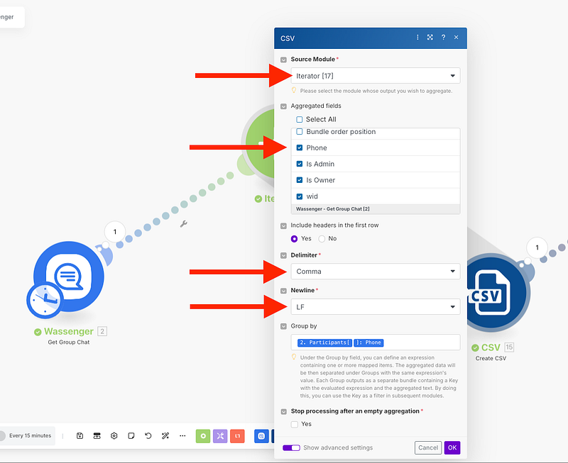 Next, we will proceed to choose the previous Iterator as the ‘Source Module’, the ‘Aggregated fields’, ‘Delimeter’ and ‘Newline’