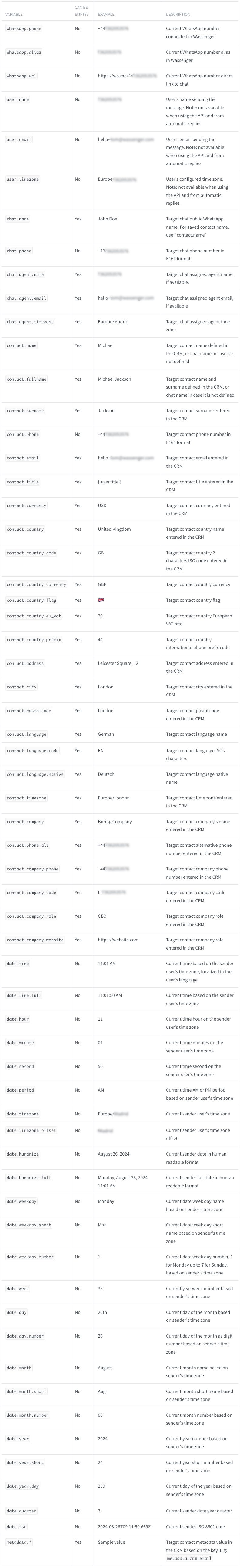 You can use the Wassenger template variable syntax to display dynamic information in your messages based on a set of pre-defined variables that are linked to the current user sending the message, or the target chat, contact, metadata and date.