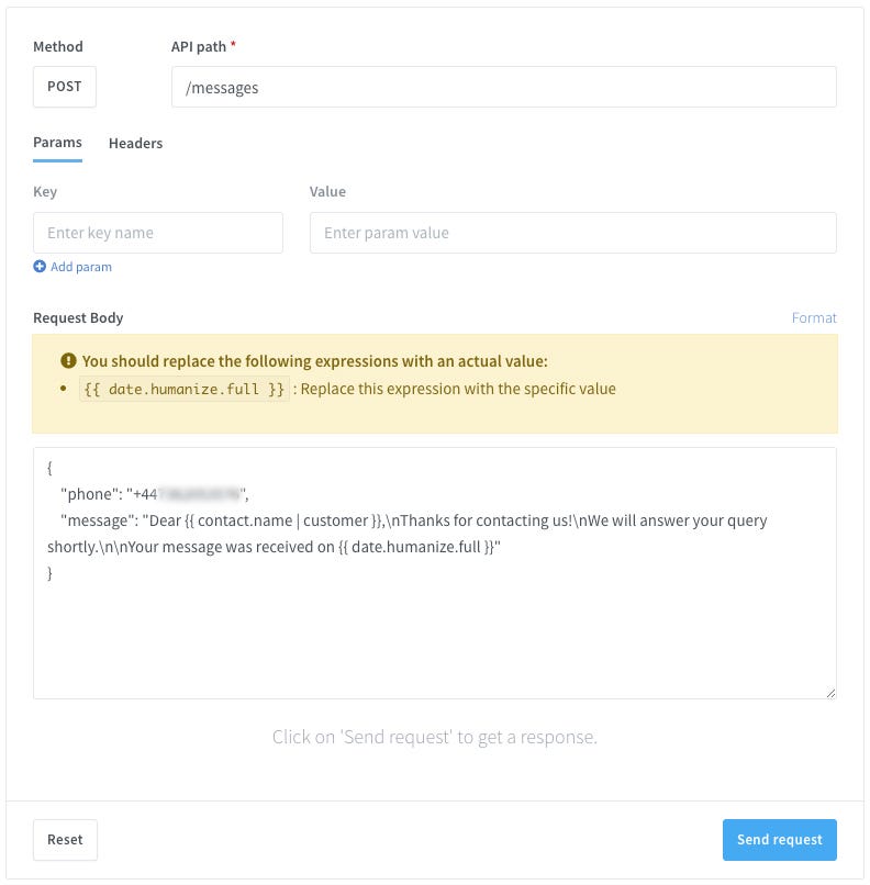 The template variable syntax can be used in any text message with double braces {{ for opening and }} to close the expression: