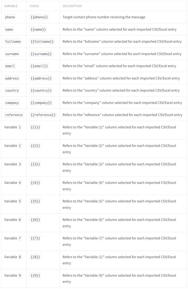 When sending messages from a Campaign, you can use the following template variables based on the imported contacts data via CSV / Excel spreadsheet file upload. Each template variable will point to the pre-selected imported column in the CSV / Excel document.