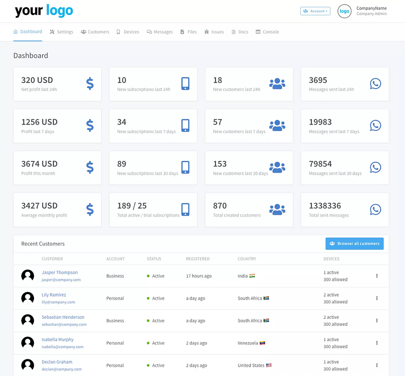 🚀 No Development Costs — Wassenger is ready to go, just rebrand it as your own! 💰 Set Your Pricing — Charge what you want and scale your business. 🎯 Sell to Any Business Using WhatsApp — It’s a high-demand service. 📊 Subscription-Based Income — Build a predictable monthly revenue stream. 🛠️ Full Reseller Control — Manage clients, customize branding, and automate billing.