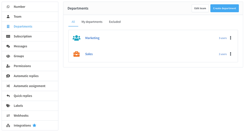 Think of Team Departments as groups for your WhatsApp agents. You can assign conversations to an entire department or a specific team member, ensuring customer messages go to the right place.