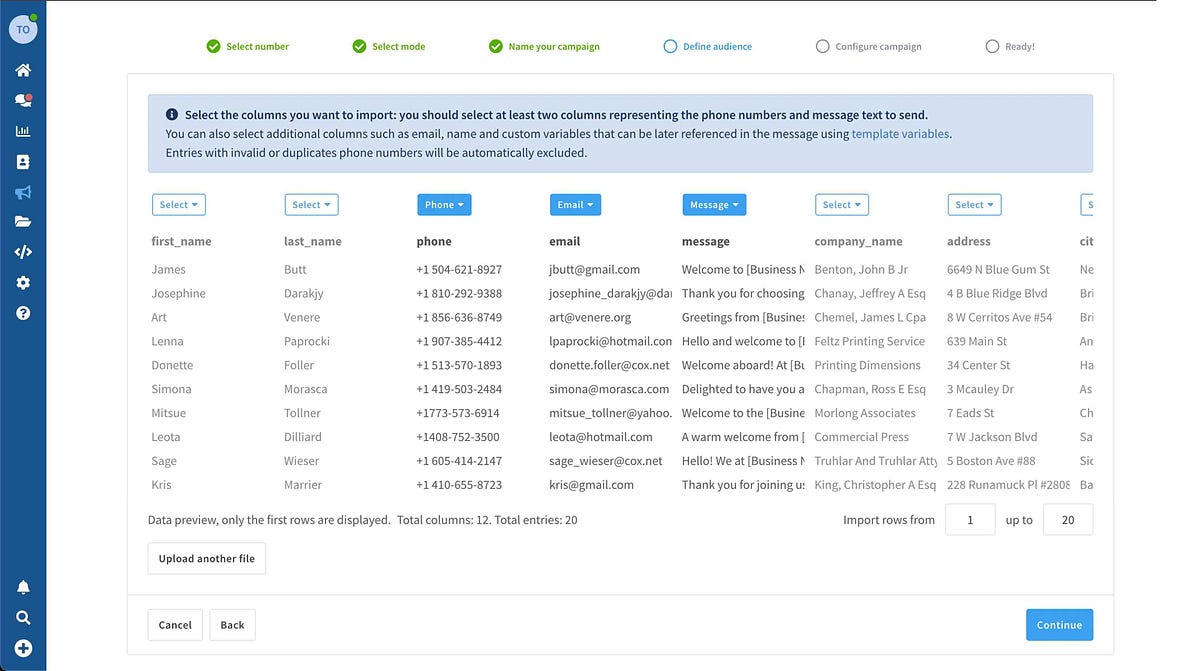 Select phone number and message columns and filter contacts to import into the campaign
