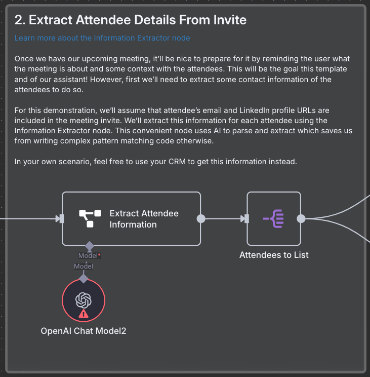 Add an Information Extractor node to parse meeting details and extract attendee information. Set up the schema to capture names, email addresses, and LinkedIn URLs. This transforms raw meeting data into structured attendee information.