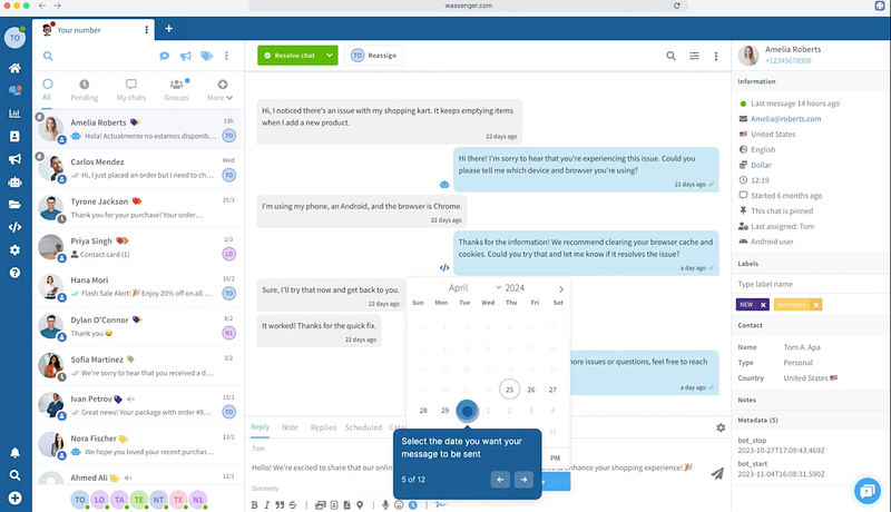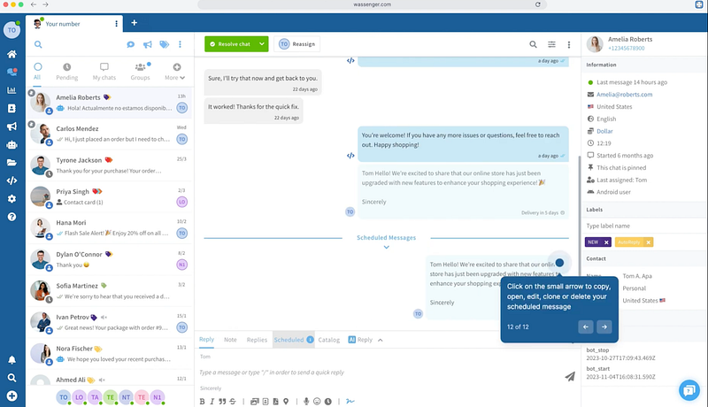 Wassenger simplifies the process of scheduling WhatsApp messages, helping you stay organized and save time. It’s a versatile tool, whether you’re managing business communications or personal reminders. With Wassenger, you can focus on what matters most while ensuring seamless and timely communication. 📱✨