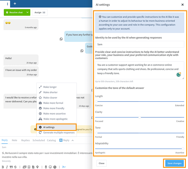 - Easily customize the tone, friendliness, assertiveness or length of the AI-generated responses.