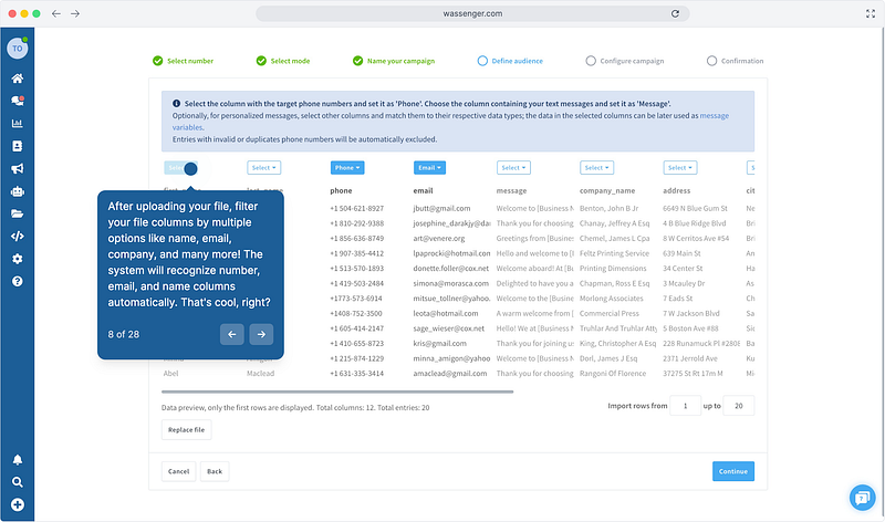 Now that we’ve chosen the option to send a personalized message per contact and named our new campaign, we need to upload our file (CSV, XLS, or XLSX) where we have stored all contacts, numbers, and messages. Wassenger will then recognize and import these data to be sent automatically through our system. Amazing!