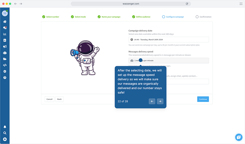Campaigns can be scheduled to be sent on a specific day and time. You can also pause, resume, or cancel campaigns at any time. The delivery speed can be set from 4 messages per minute to 1 message every 5 minutes, with a recommended pace of no more than one message per minute to avoid spam detection by WhatsApp.