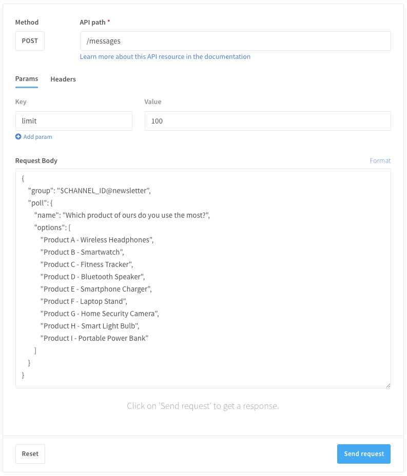.body("{\"group\":\"$CHANNEL_ID@newsletter\", \"poll\":{\"name\":\"Which product of ours do you use the most?\", \"options\":[\"Product A - Wireless Headphones\", \"Product B - Smartwatch\", \"Product C - Fitness Tracker\", \"Product D - Bluetooth Speaker\", \"Product E - Smartphone Charger\", \"Product F - Laptop Stand\", \"Product G - Home Security Camera\", \"Product H - Smart Light Bulb\", \"Product I - Portable Power Bank\"]}}")