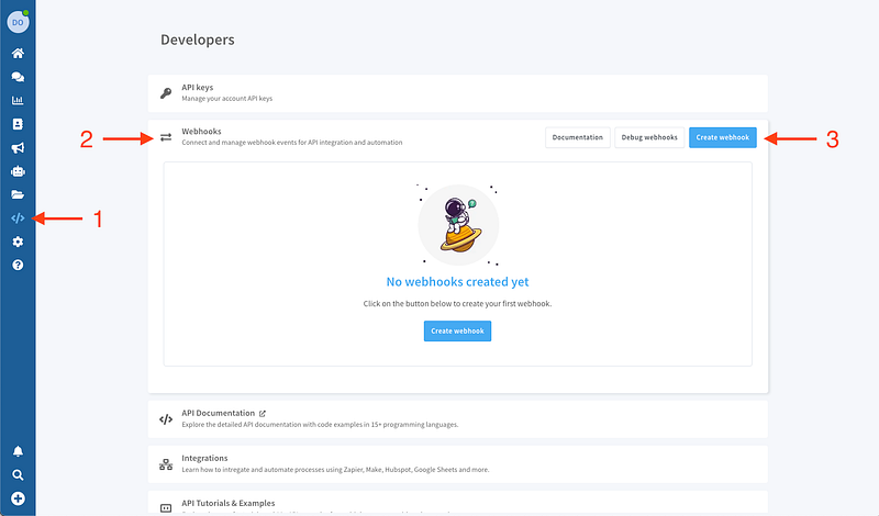 Now we need to open our Wassenger’s developers panel as shown in the image below: Left navbar > Developers > Webhooks > Create new webhook