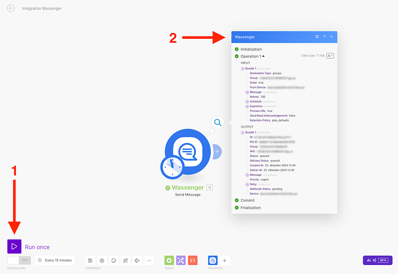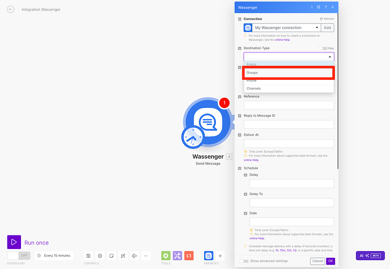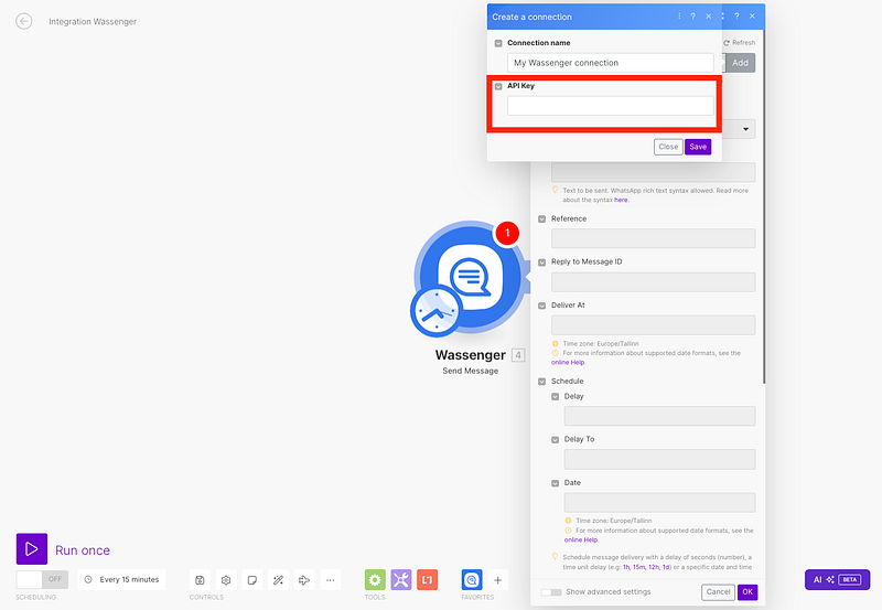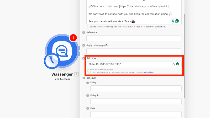 In case you want to schedule the message, you can enter a new parameter in your Wassenger module like so: