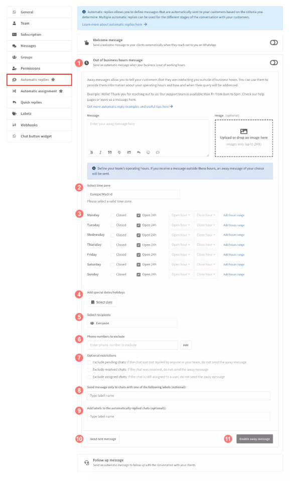 Firstly, WhatsApp Business has only two kinds of automatic replies: greetings and away messages. Our automatic replies tool offers follow-up messages as well, which are a potent asset for engaging with customers even after a conversation.