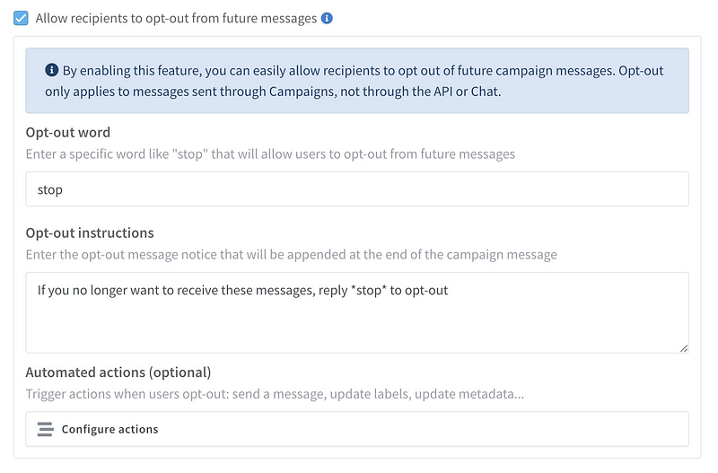 1. Enhanced User Control Your customers can now manage their communication preferences effortlessly. No more frustrated users bombarding your support team — they simply reply with your custom trigger word (like “stop” or “unsubscribe”) and they’re automatically opted out.