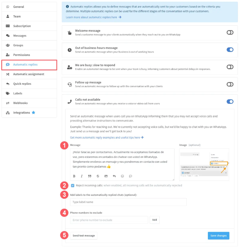- Optionally, select one or multiple labels that should be added to the user’s chats when the automatic reply is triggered. This may help you better categorize and identify chats from users who tried to call you.