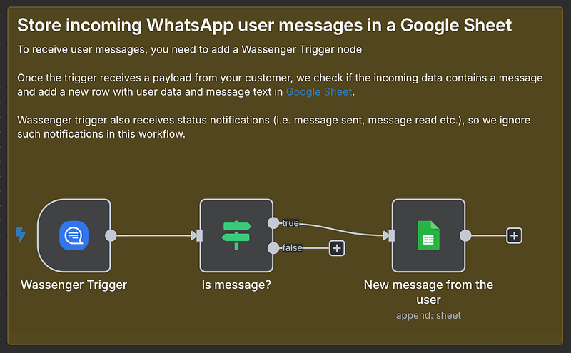 "content": "## Store incoming WhatsApp user messages in a Google Sheet\nTo receive user messages, you need to add a Wassenger Trigger node\n\nOnce the trigger receives a payload from your customer, we check if the incoming data contains a message and add a new row with user data and message text in [Google Sheet](https://docs.google.com/spreadsheets/d/1T-B0yepcrCHxQpn7Sj6QjTa0VqwwVBQhO5ZcIUSxWJE/edit?gid=1621824221#gid=1621824221).\n\nWassenger trigger also receives status notifications(i.e.message sent, message read etc.), so we ignore such notifications in this workflow.",