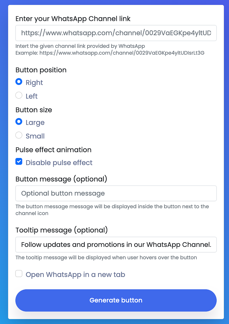 - Go to Wassenger’s WhatsApp Channel Button generator.