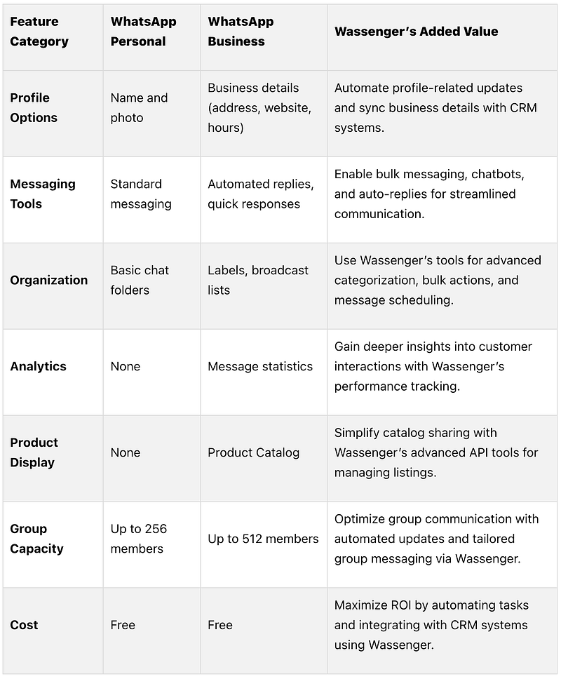 WhatsApp offers two versions: Personal for individual communication and Business for companies. While both have unique strengths, leveraging Wassenger can unlock their full potential for personal and professional use